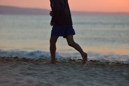 Man walks along the sandy beach as the sun sets behind him. Person running toward the water at sunset beach