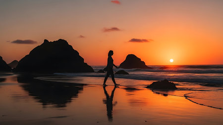 One woman walking on the beach, enjoying the serene sunset generated by artificial intelligence
