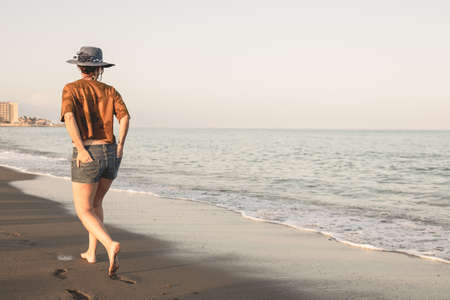 Beautiful young woman walking on the beach at sunset. Vacation concept.