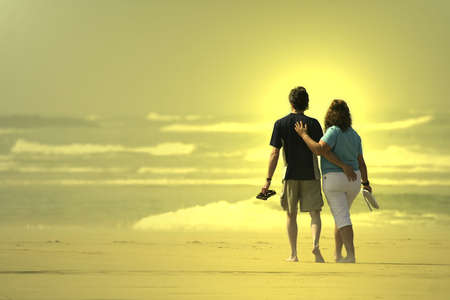 A romantic couple walking hand in hand on a beautiful sandy beach