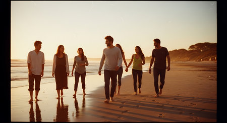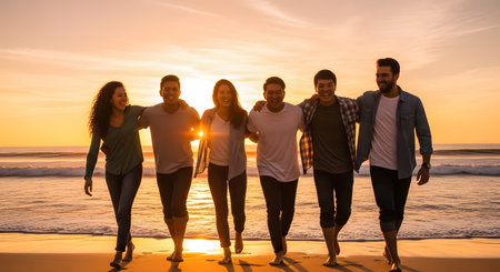 A happy and diverse group of young friends walks along the shoreline with their arms around each other, laughing and enjoying the beautiful golden sunset. The warm light silhouettes their figures as they walk towards the camera. The image represents friendship, togetherness, youth, and summer vacation.