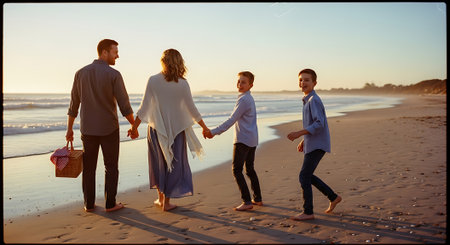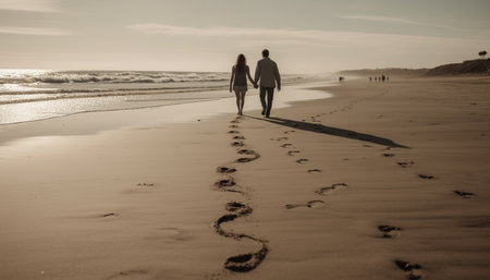 Straight couple walking on the beach, holding hands at sunset generated by artificial intelligence