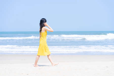 Beach travel concept - woman walking on sandy beach leaving footprints in the sand