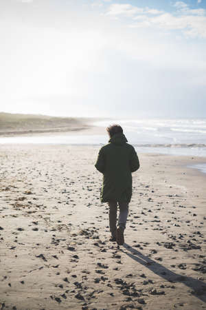 Rear view of man strolling on windy beach, Sorso, Sassari, Sardinia, Italy