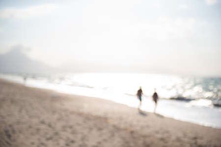 Blured landscape with Mediterranean sea and walking people in sun beams. Beach at sunset
