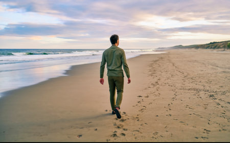 A man strolls leisurely on the beach surrounded by golden sand and gentle waves basking under the sun.