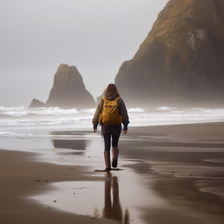 Woman Traveler on Oregon Pacific Coast during Rainy Day AI