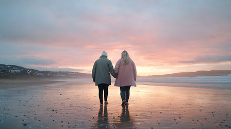 A couple strolls along a peaceful beach at sunset embodying romantic tranquility.