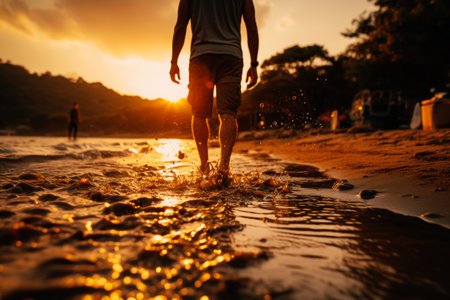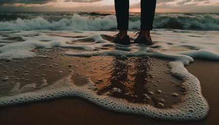 One person walking barefoot on wet sand at sunset generated by artificial intelligence