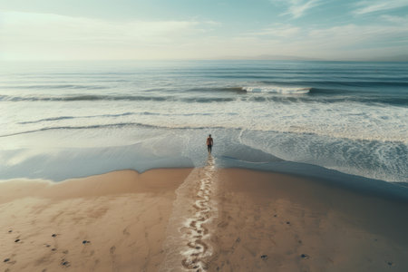 a man walks along a serene beach, surrounded by trees and overlooking the sea. this captivating photo captures the juxtaposition of hard and soft lines, creating a visually striking composition. with its 8k resolution, misty atmosphere, and the artistic touch of alasdair mclellan, this aerial photograph evokes a sense of romantic emotivity and humanistic empathy. ai generated