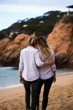 Two individuals are taking a leisurely stroll along the beautiful, sandy beach, enjoying the scenery and the calming sounds of the waves