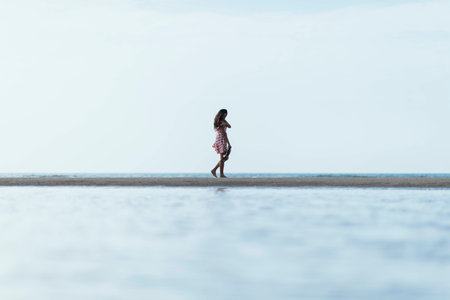 Woman walking away in the distance across a sandy tropical beach to the sea on a sunny spring or summer day with copy space in a vacation or travel concept