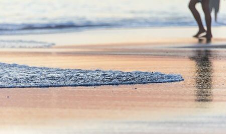 You can see the legs of three people that have come off the ocean beach and the reflection of these people in the wet sand.