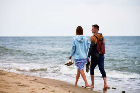 Baltiysk, Russia - 08.01.2021 - Loving couple walking barefoot along seashore. Young man and woman dating by Baltic Sea. Candid couple talking about their romantic relationship, simple lifestyle