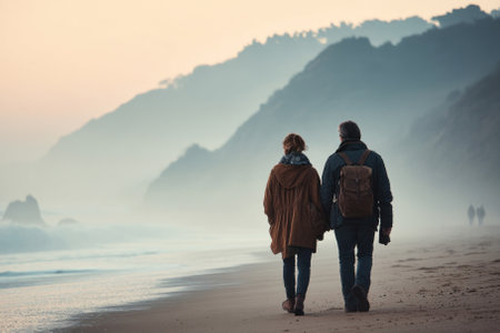 Two figures stroll together on a misty beach as soft waves gently touch the shore at dawn