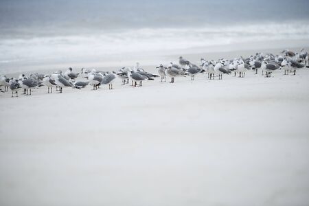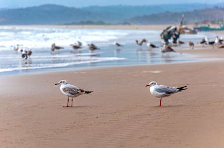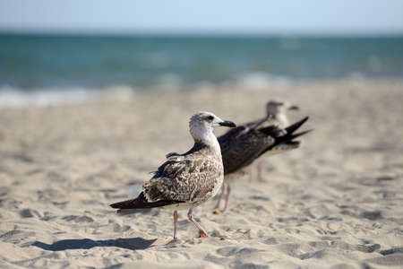 Seagulls sitting on the beach, searching for food. Selective focus.