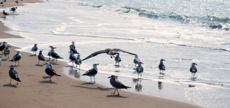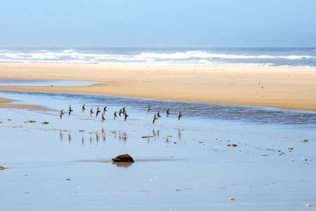 Flock of sea birds running along the edge of the ocean surf, clear sunny morning, horizontal aspect