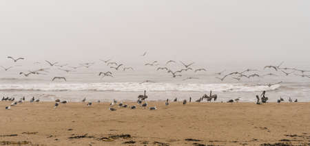 Large group of seabirds on the beach, stormy Pacific ocean background. Panoramic view, overcast foggy day, California Coastline