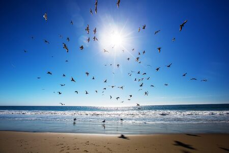 Flock of sea birds on the beach, California coastline. Wilderness area, clear blue sky background