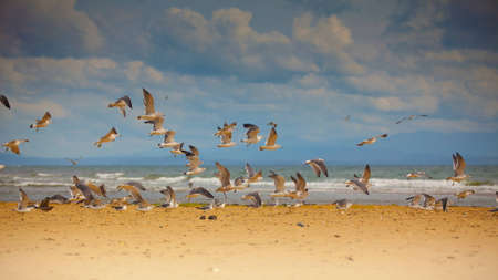 Flock of birds flying on the beach, beautiful cloudy sky background, panoramic view