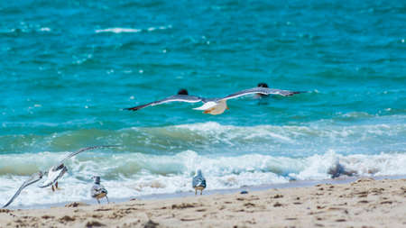 flock of sea gulls flying fighting for food on beach by the sea. Image with selective focus