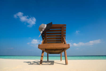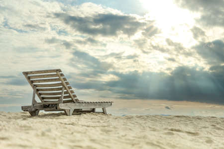 Wooden deck chair on the beach in sunny day. Vacation concept