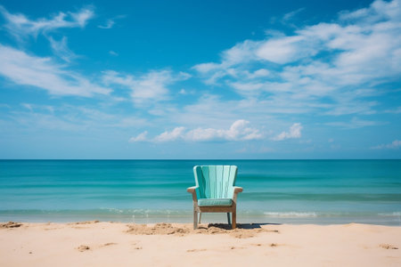 A serene beach scene featuring an empty chair facing a tranquil ocean. The calm blue waters and sandy shore create an idyllic atmosphere for relaxation and escape.