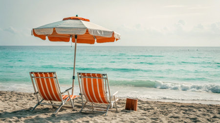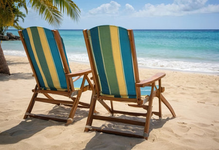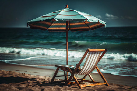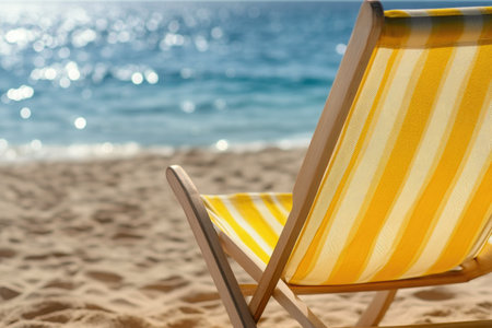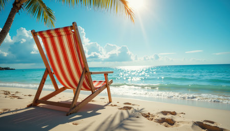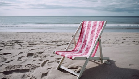 Tranquil coastline, striped deck chair, bright sun, folding chair freedom generated by artificial intelligence