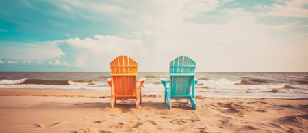 Experience the beauty of a tranquil beach scene featuring colorful lounge chairs facing calming ocean waves and a bright sky. Perfect for conveying relaxation and vacation vibes.