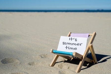 ITS SUMMERTIME text on paper greeting card on background of beach chair lounge summer vacation decor. Sandy beach sun. Holiday concept postcard. Travel
