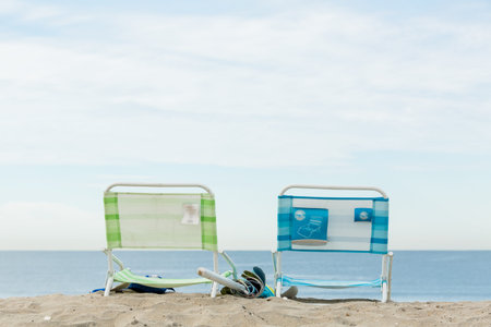 A pair of beach chair over the sand with a pastel blue background, copy space summer relax concept