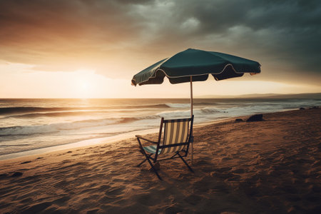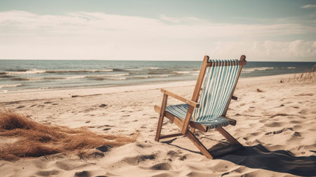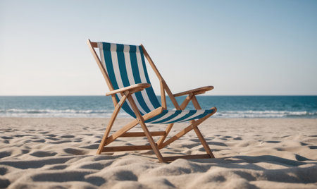 An empty beach chair sits on the sand, inviting tranquility as it faces the calm ocean waves. Ideal setting for relaxation and rejuvenation by the water.