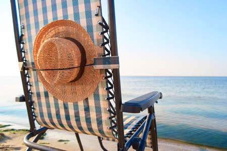 Colorful beach chair with hat on the beach and sea waves and blue sky in the background.