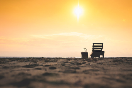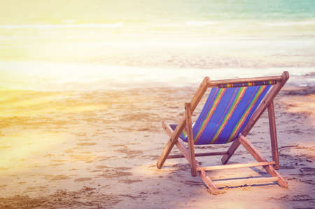 Wooden striped deckchair at ocean sandy beach with sunset light and vintage tone