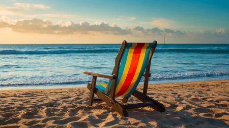 A beach chair with red stripes sits on soft sand, accompanied by a straw hat and sunglasses. The tranquil ocean waves gently lap the shore under a beautiful sky at sunrise, inviting relaxation and leisure.