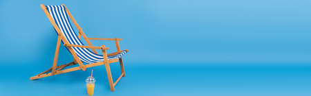 Striped empty deck chair with lifebuoy on blue. 3d illustration