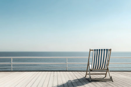 A solitary deck chair with blue and white stripes sits on a wooden deck overlooking a tranquil ocean. The clear sky and calm waters create a serene atmosphere, inviting relaxation and contemplation in this peaceful seaside setting.