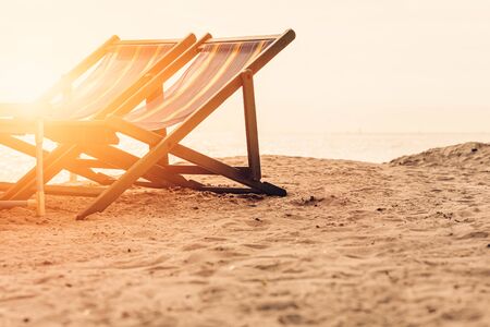 Couple relax chair on sand beach with warm sunset - vacation in beautiful sea nature concept