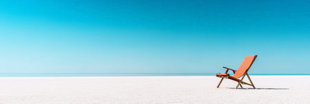 Minimalist image depicting a wooden deck chair with orange fabric on a white sand beach facing a calm turquoise sea under a clear blue sky, creating a perfect vacation setting