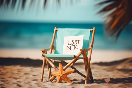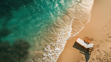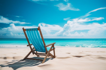 A picturesque beach scene featuring a wooden deck chair on soft, white sand, surrounded by the shimmering ocean and vibrant blue sky, ideal for vacation and relaxation imagery.