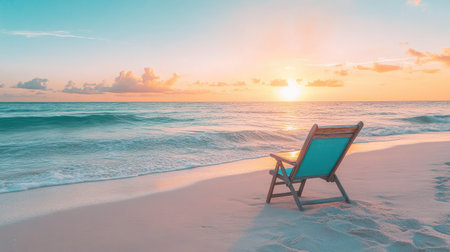 A tranquil beach scene features a single chair facing gentle waves. The colorful sunset casts a warm glow over the sand and water, inviting relaxation.