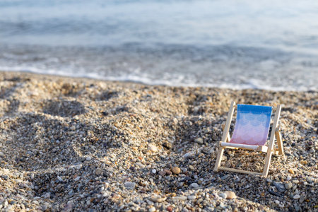 a miniature deck chair on the sand of a lonely beach, with the sea in the background and some blank space on top