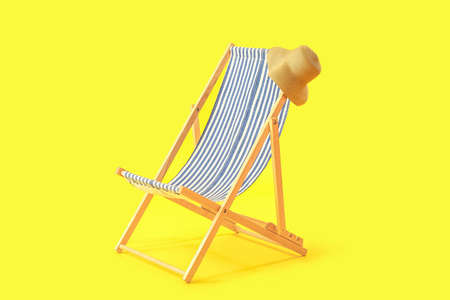 beach loungers over yellow background, summer vacation concept, panoramic image