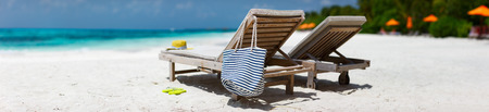 Empty wooden beach chairs on the tropical beach, vacation. Traveler dreams concept