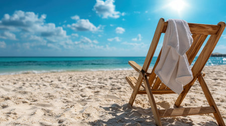 A beach chair with a towel draped over it. The chair is on a sandy beach with a clear blue sky above. Concept of relaxation and leisure