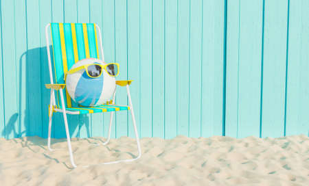 ball with sunglasses on top of a chair on beach sand with blue wooden wall and space for text. 3d render