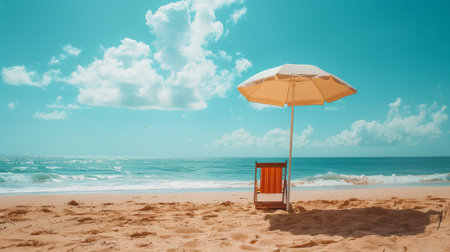 Minimalist beach scene featuring an inviting orange deck chair on pristine white sand, overlooking a tranquil turquoise ocean under a clear blue sky, evoking a sense of peaceful summer vacation