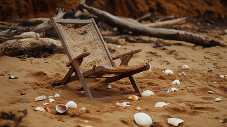 A rustic beach chair sits on a sandy shoreline, surrounded by seashells and driftwood. This image captures the essence of relaxation and the beauty of a serene coastal environment.