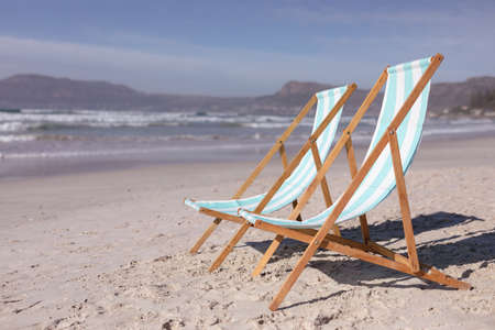 View of two deck chairs on the beach with sea waves. summer beach holiday concept.