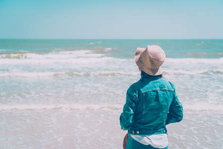 Freedom feel good and travel adventure concept. Copy space of woman stand looking view with blue sky and wind wave on beach background. Vintage tone filter effect color style.